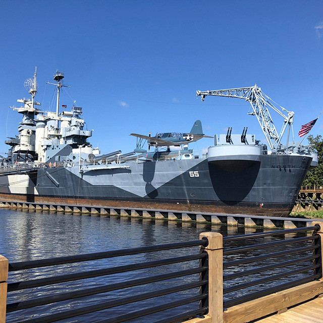 In Wilmington, North Carolina, tour this restored World War II era battleship, a National Historic Landmark and official World War II memorial. Across from Wilmington's historic downtown, you can explore nine decks, crew living spaces and World War II artifacts on this floating museum. Around the ship, you can stroll along a walkway to appreciate this monument from all angles or take a break in adjacent Battleship Park.